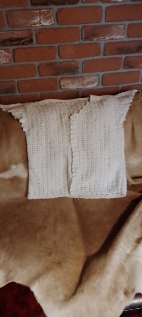 Haak het rechter voorpand in spiegelbeeld. Begin dan onder bij de boord met 3 kantstokjes. Hecht alle draden af.